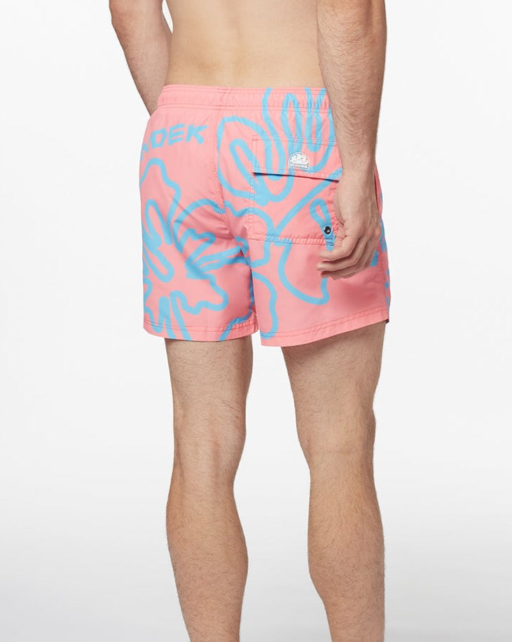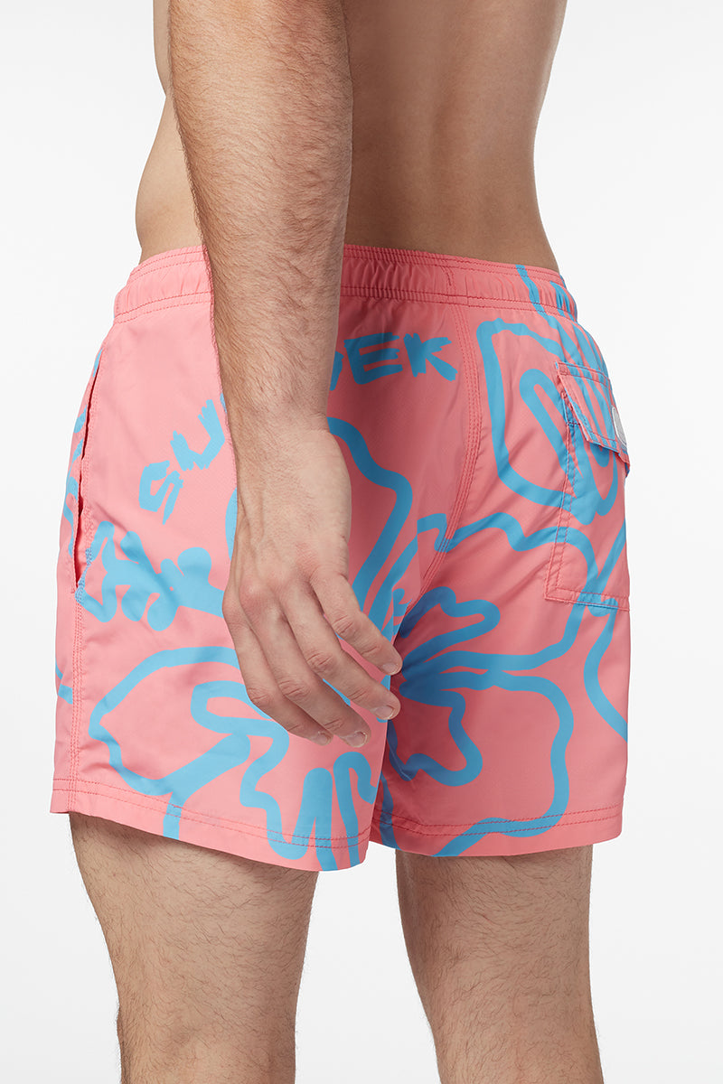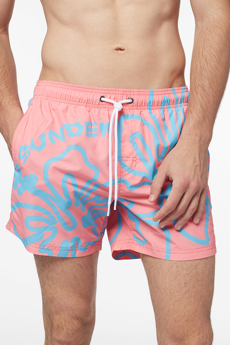 L'originale stampa handsketiching non farà passare inosservato questo costume mare da uomo corto a vita elasticata. Realizzato in leggero poliestere riciclato, è un modello con elastico in vita e coulisse, a garanzia di massimo comfort e aderenza.