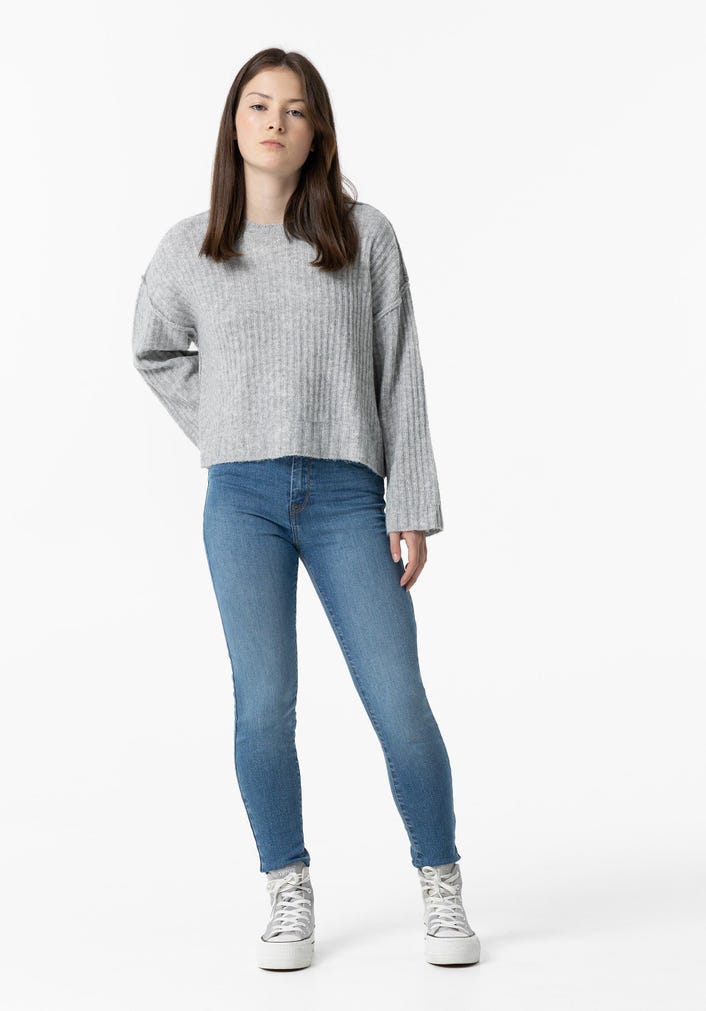 Jeans skinny a vita alta con cinque tasche. Chiusura frontale con chiusura a zip e bottone in metallo.