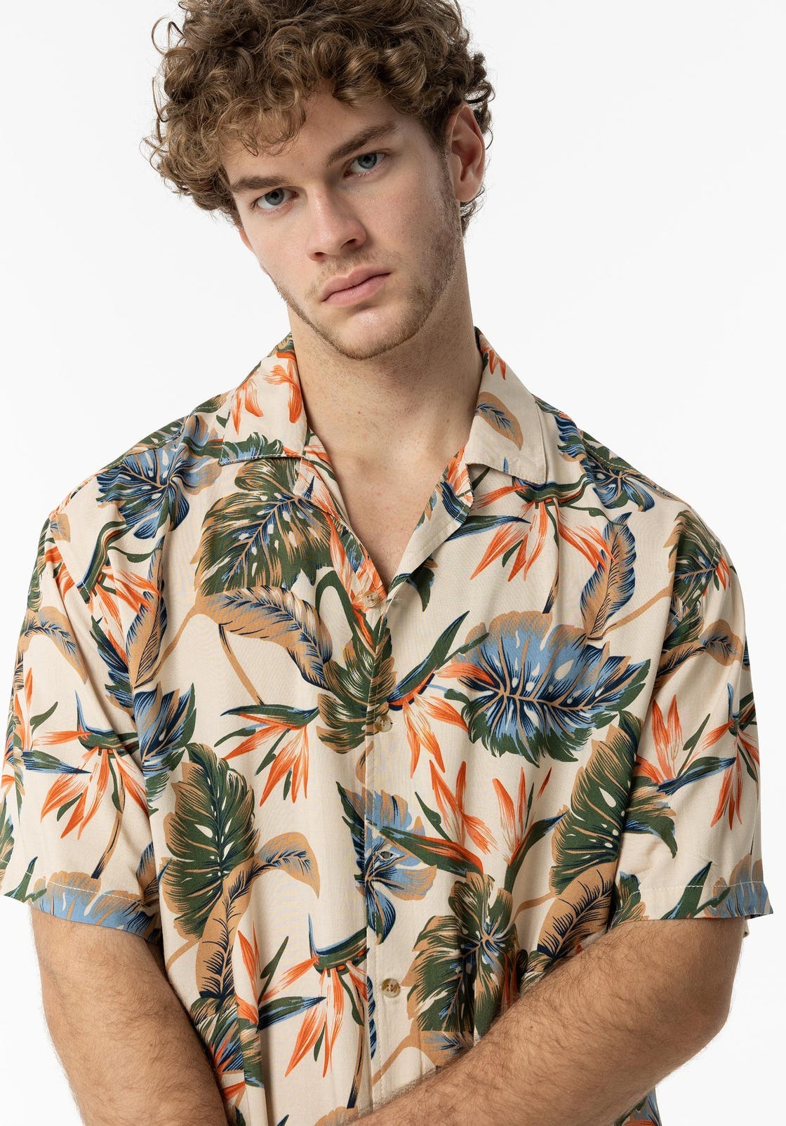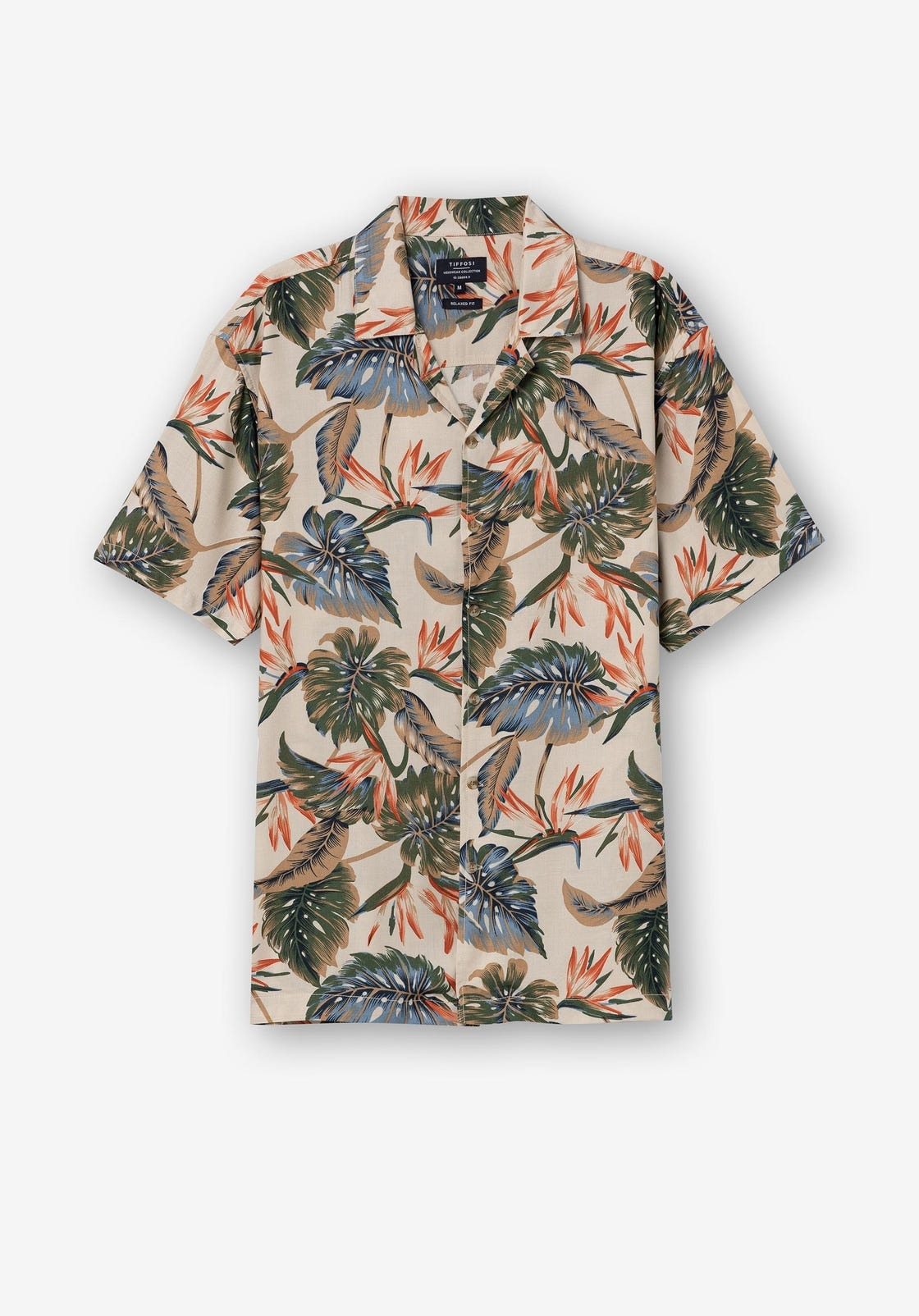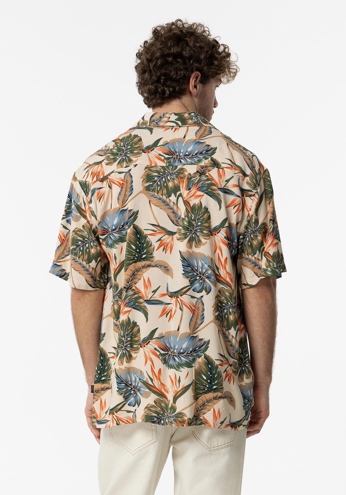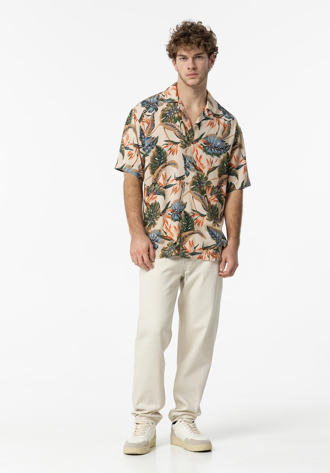 Camicia a maniche corte con colletto cubano. Chiusura frontale con bottoni. Fondo con aperture laterali.