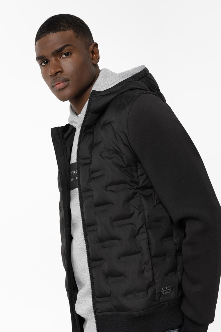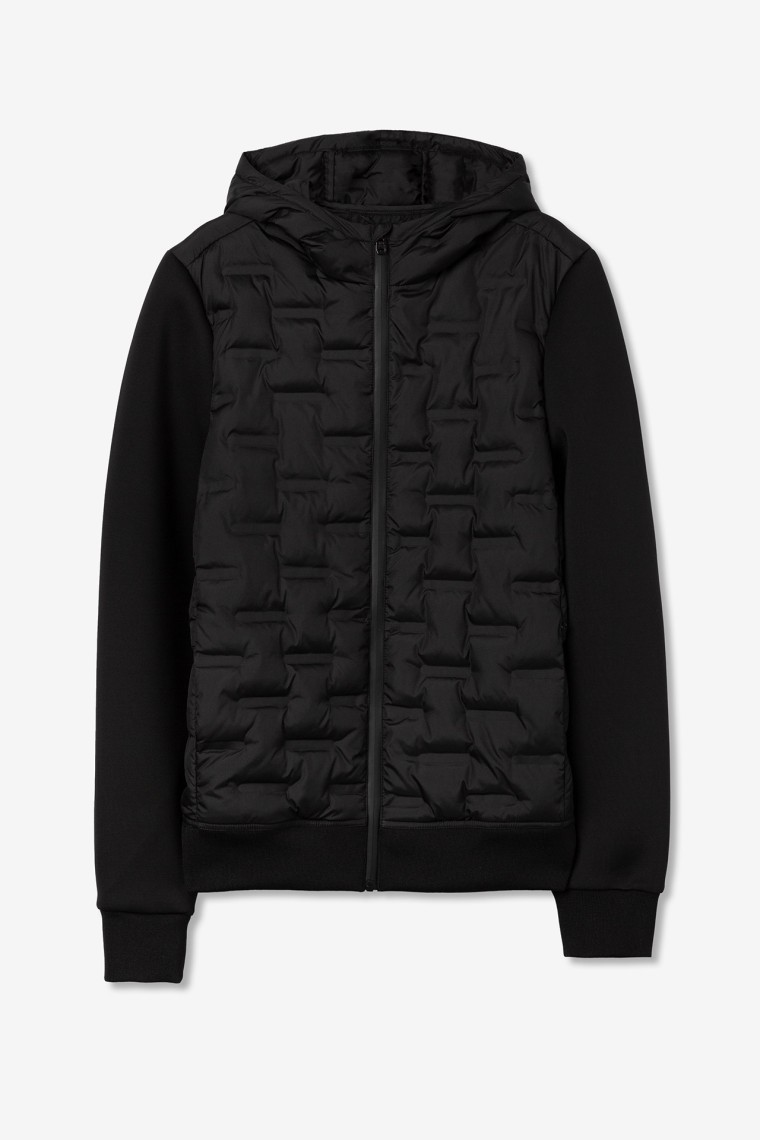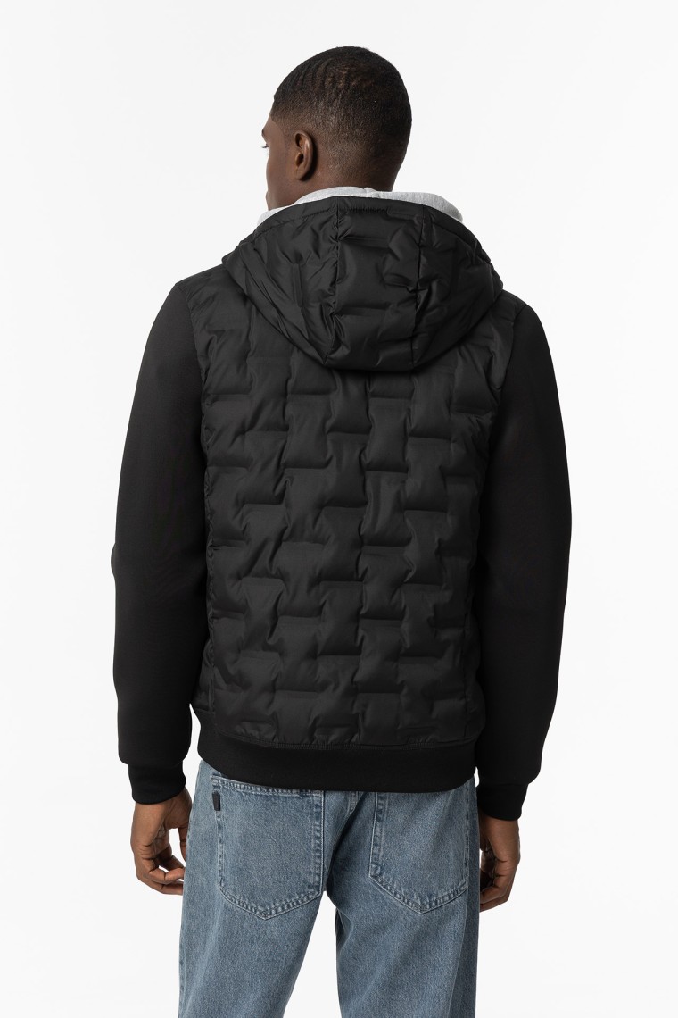 Giacca imbottita con cappuccio e maniche lunghe. Tasche laterali. Bordi a costine. Patta con cerniera anteriore. Tasca interna.