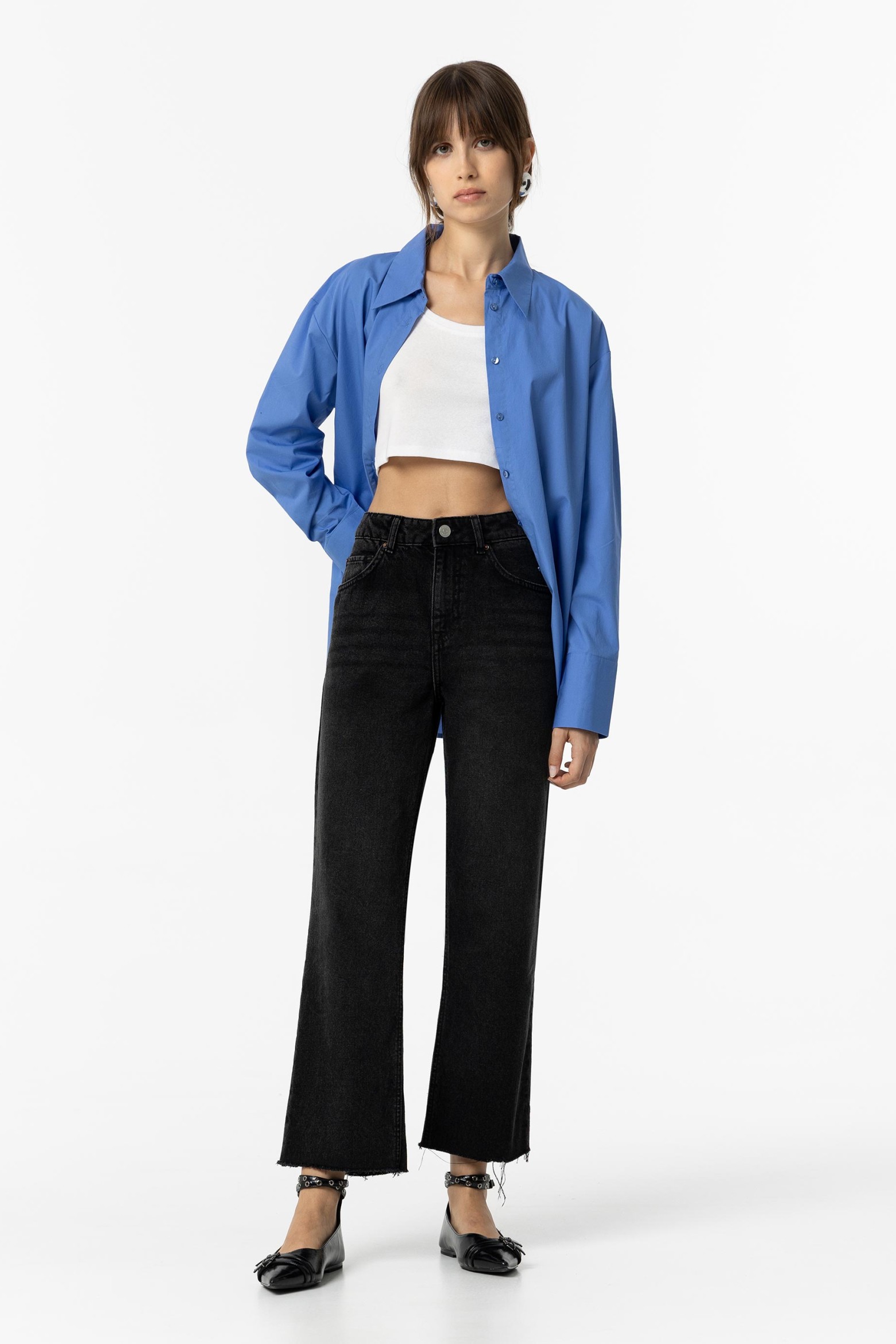 Jeans a vita alta, gamba dritta con cinque tasche. Chiusura frontale con zip e bottone in metallo. Orli sfrangiati.