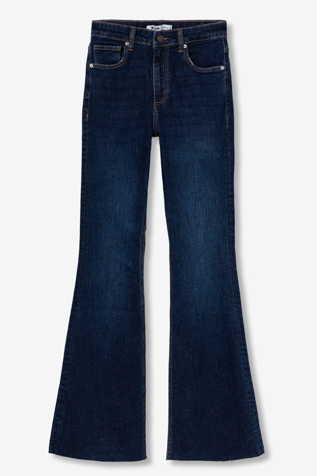 Jeans a vita alta con cinque tasche e gamba svasata. Chiusura frontale con zip e bottone in metallo.