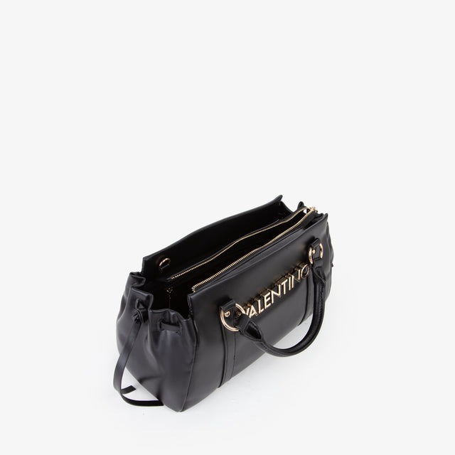 Shopping a mano, dalle piccole dimensioni, con logo in lettere metalliche grandi.