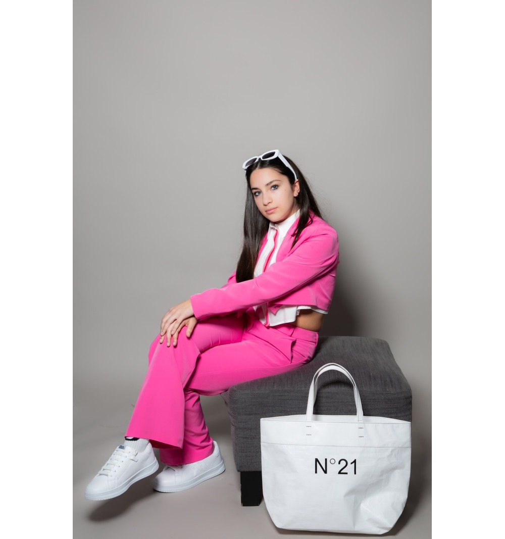 Vita alta, gamba larga per il pantalone di Vicolo Girl. Modello tasche a filo, chiusura con mosca a scomparsa, vita regolabile con coulisse interna.