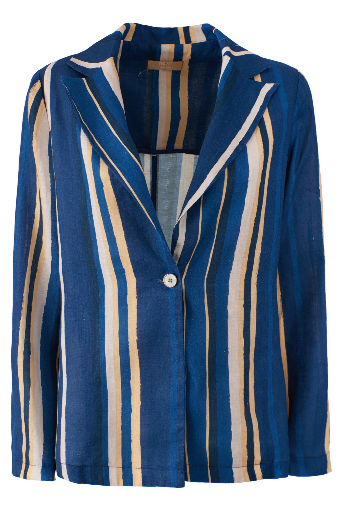Giacca con fantasia a strisce multicolore, chiusura tramite bottone centrale, maniche lunghe, taglio classico