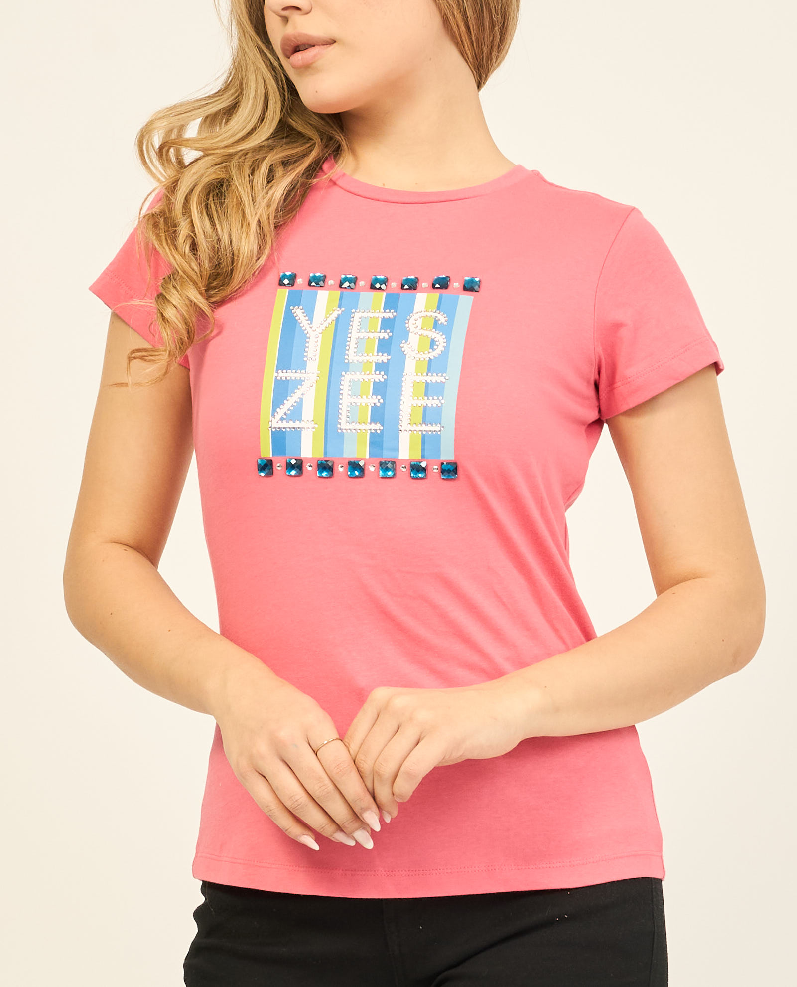 T-shirt donna firmata Yes Zee in cotone modello girocollo con logo stampato sul davanti e impreziosito da applicazioni.